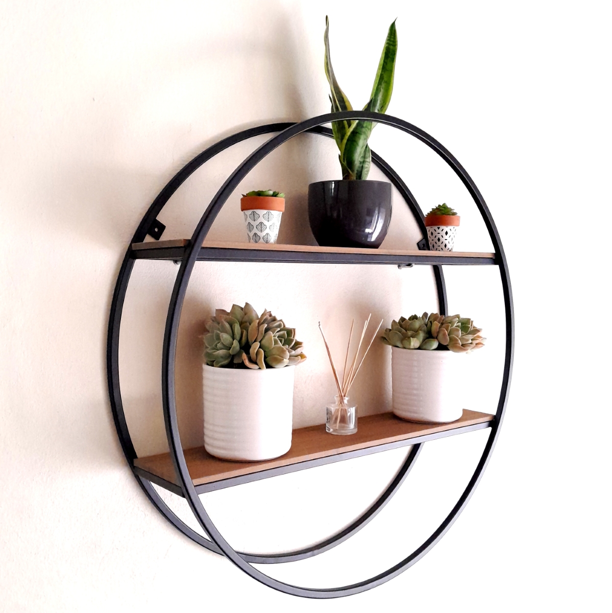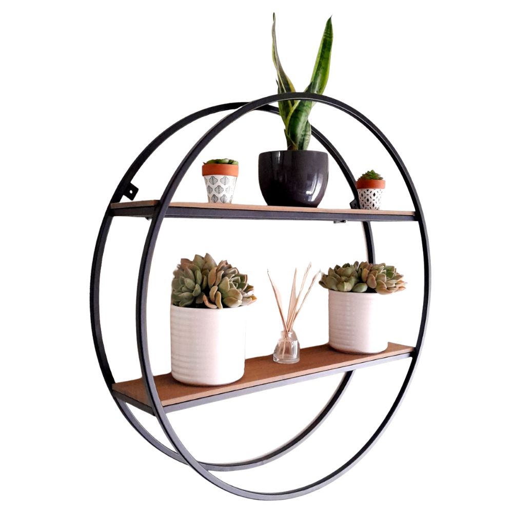 No need to treat or care for the wood shelves. 750mm diameter circle frame and with a depth of 200 mm.